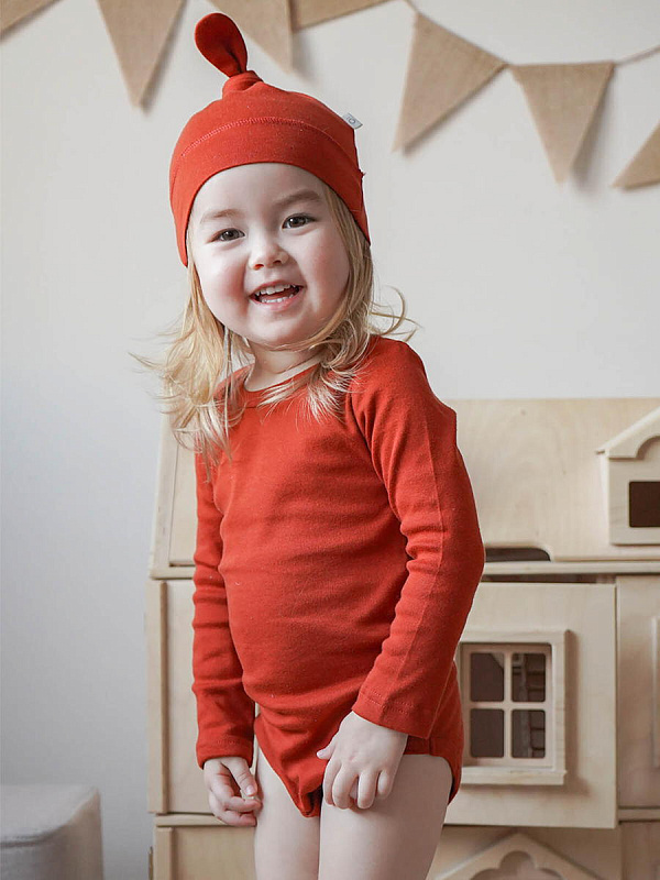 Боди Mjölk [мьёльк] Paprika с длинным рукавом выполнен из тонкого 100% трикотажного хлопка. Плетение нитей в этой ткани менее плотное, чем у другой одежды из нашей коллекции, что позволяет комфортно использовать боди в качестве первого слоя.