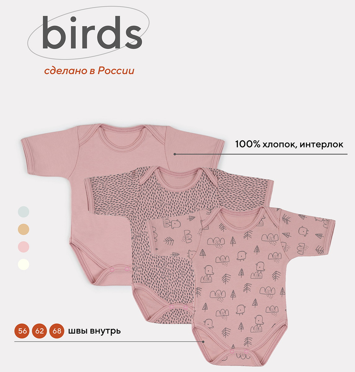 Боди MowBaby Birds с коротким рукавом 3-шт 6282 Rose 68