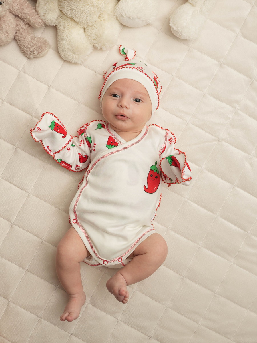 Боди Папитто "Перчики" - это комфортная и удобная одежда для новорожденных с закрытыми ручками. Он сшит из 100% хлопка, что обеспечивает нежный контакт с кожей ребенка.