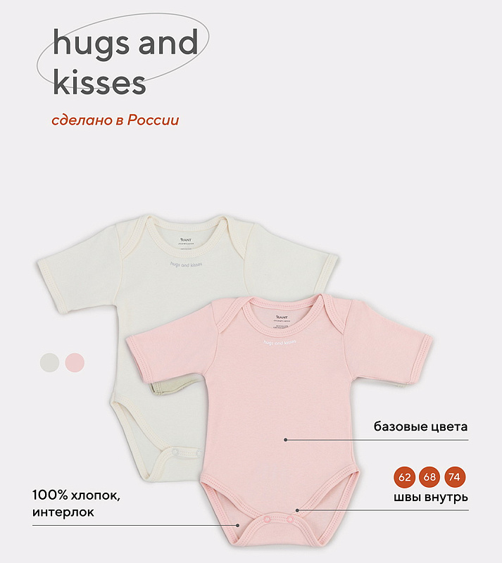 - Свежая коллекция Hugs and kisses покажет всю вашу нежность и заботу. Актуальные однотонные расцветки, лаконичный дизайн, качественная фурнитура в тон и хлопок премиум класса (интерлок-пенье)