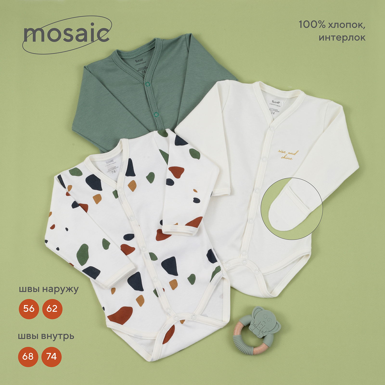 Одежда Rant Mosaic с особым вниманием создана для новорожденных и малышей постарше. Базовые цвета, актуальный мозаичный принт, лаконичное исполнение, премиальные ткани - визитная карточка наших моделей.
