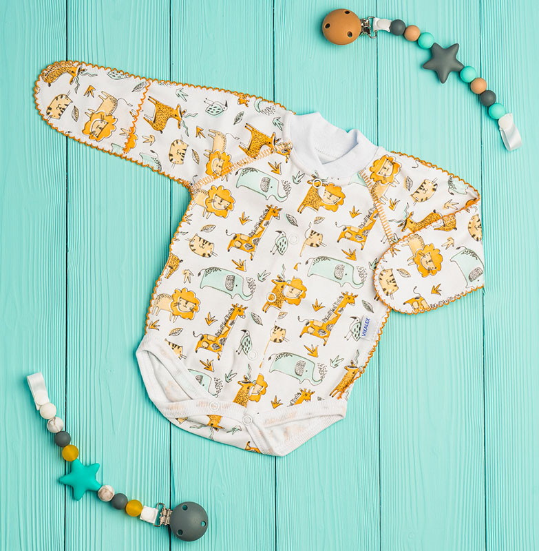 Боди удобно и легко надеть на ребёнка благодаря кнопкам-застёжкам по всей длине. Модель со швами наружу, которые не будут доставлять малышу неудобств. Рукава с отворотами-царапками. Проймы для ног отделаны кантом. Изделие из натуральной дышащей ткани.