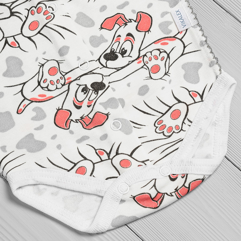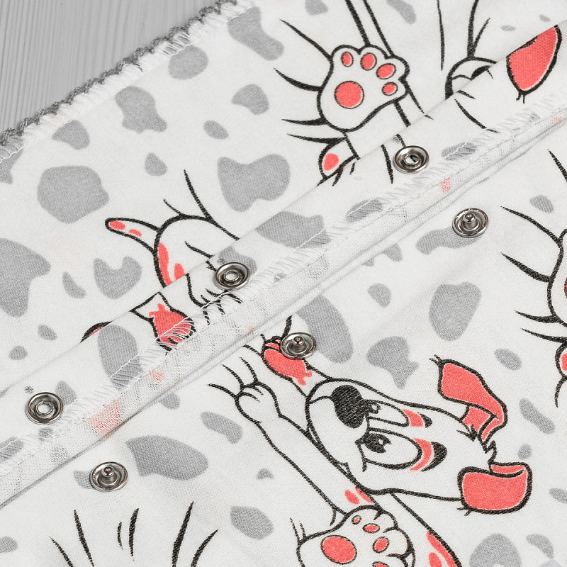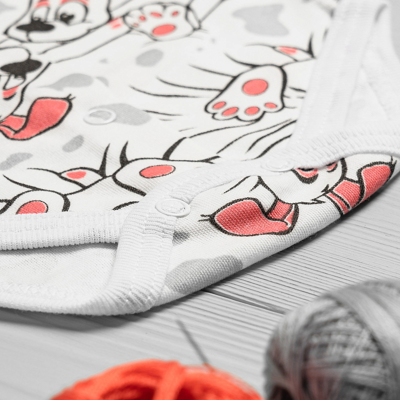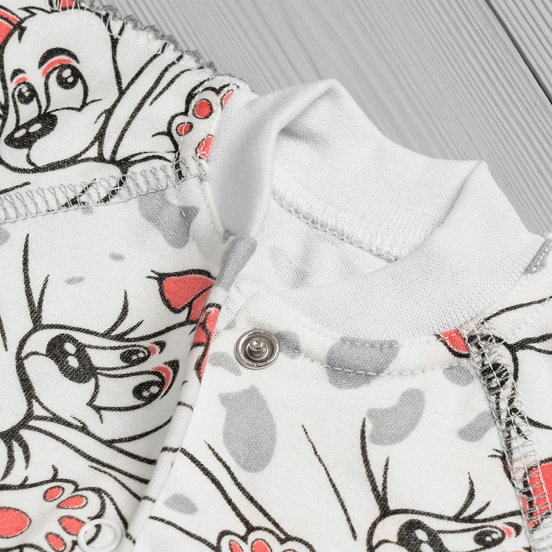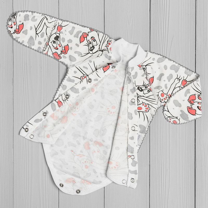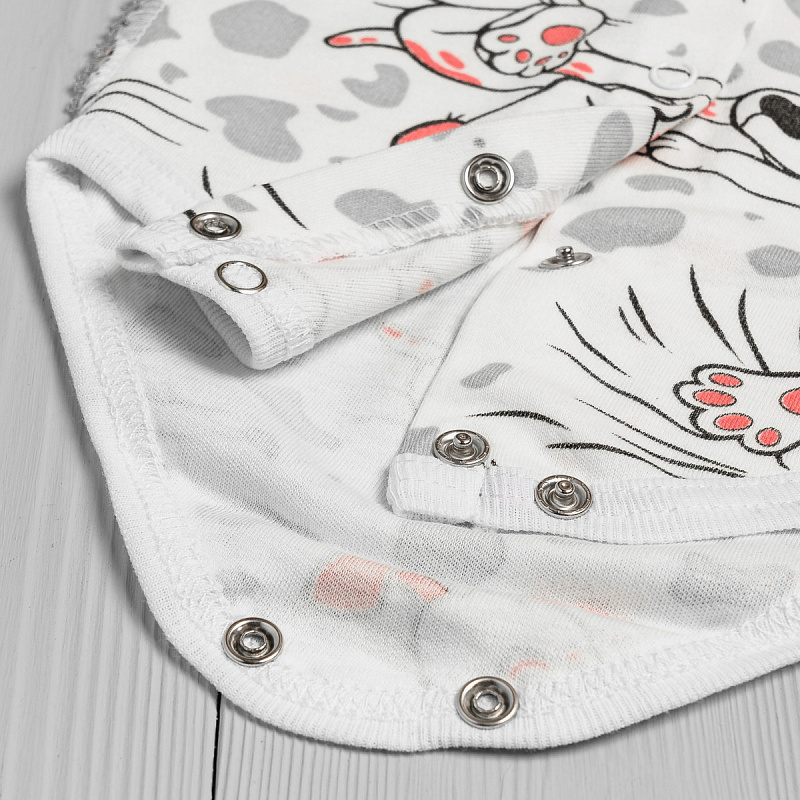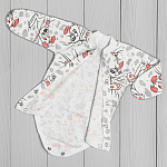 Боди удобно и легко надеть на ребёнка благодаря кнопкам-застёжкам по всей длине. Модель со швами наружу, которые не будут доставлять малышу неудобств. Рукава с отворотами-царапками. Проймы для ног отделаны кантом. Изделие из натуральной дышащей ткани.