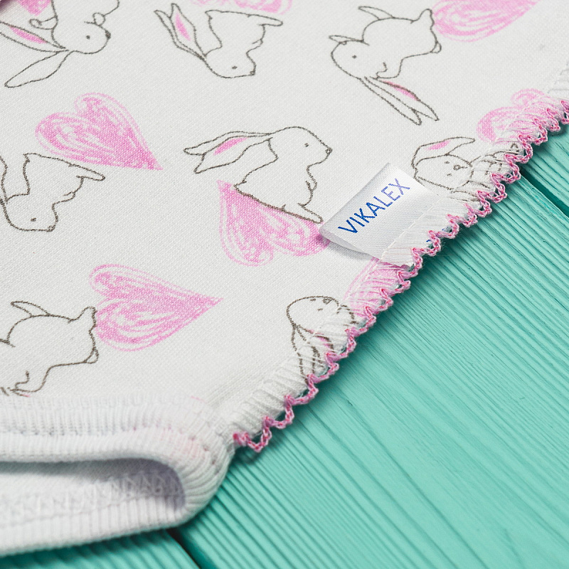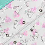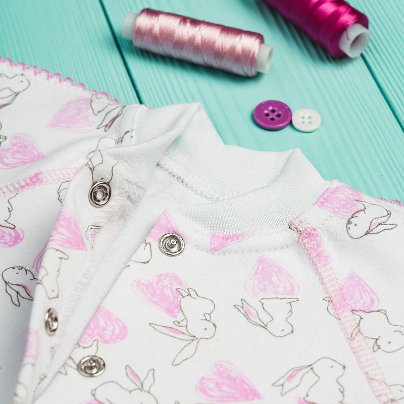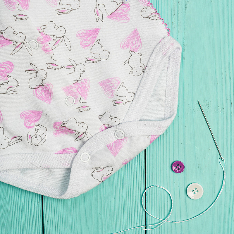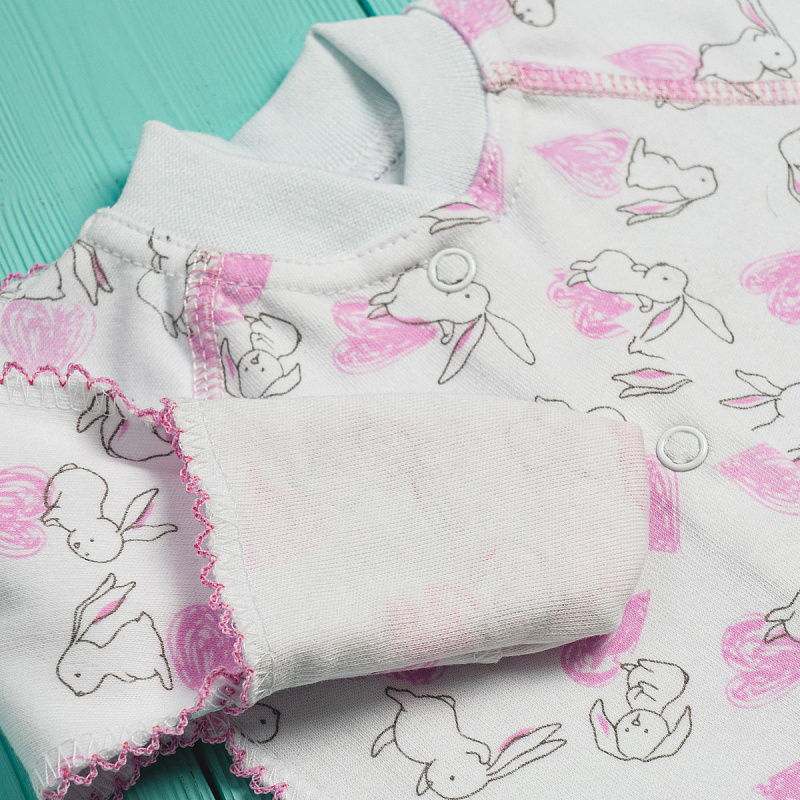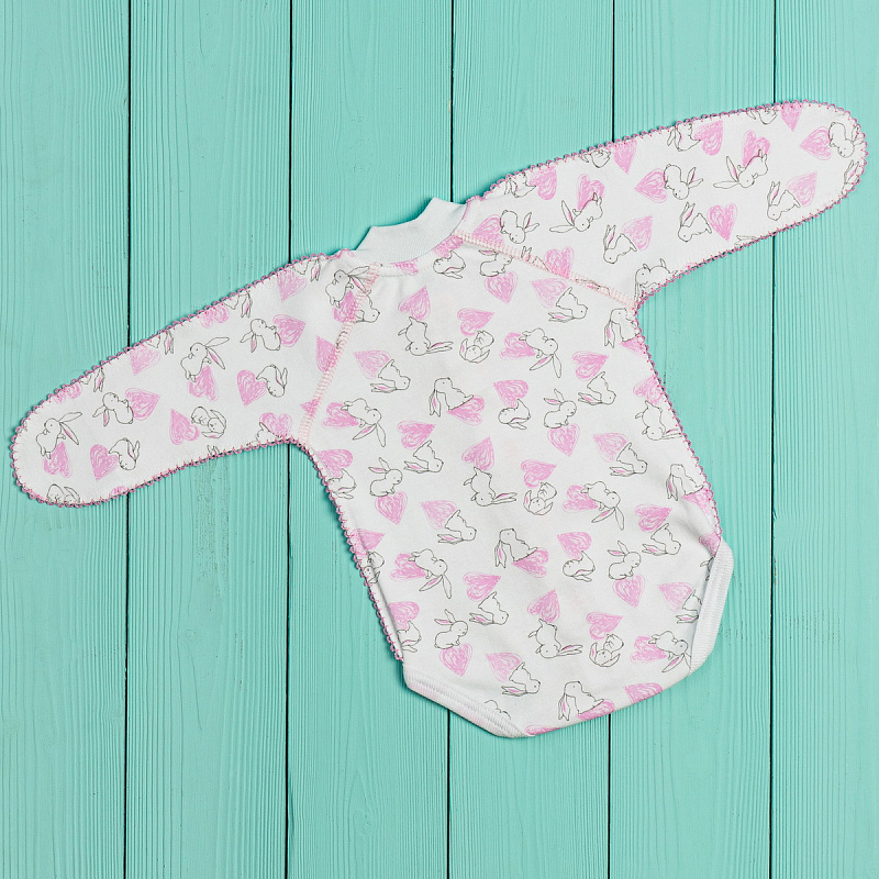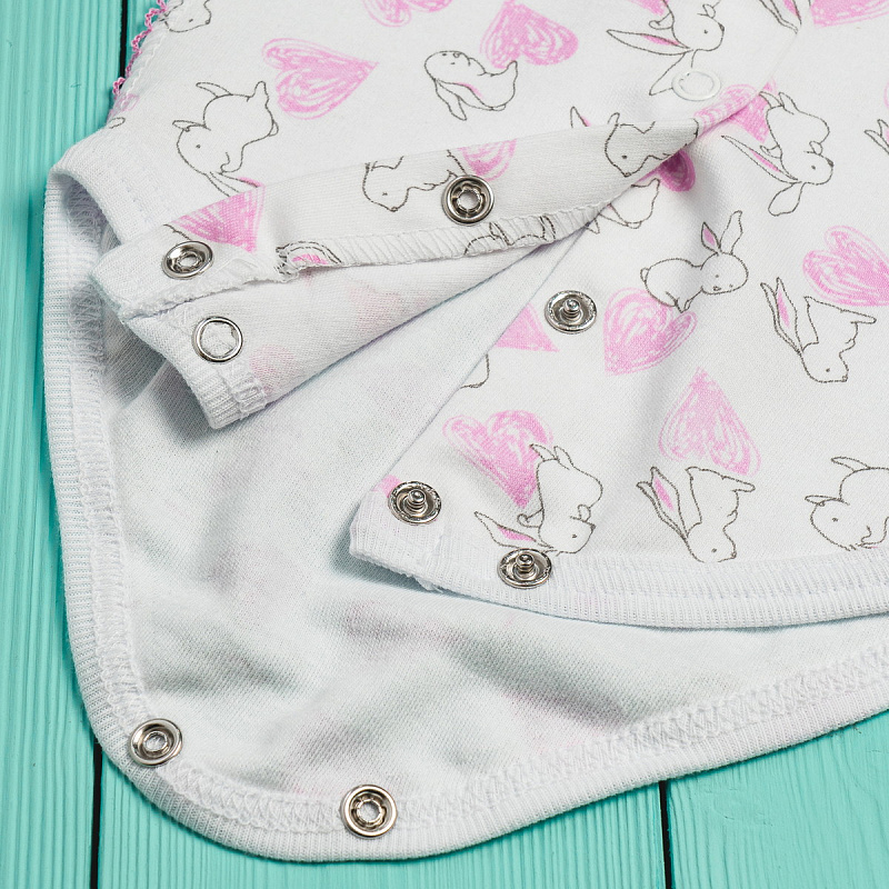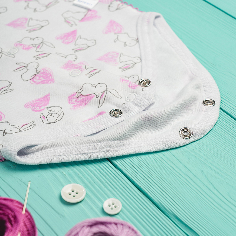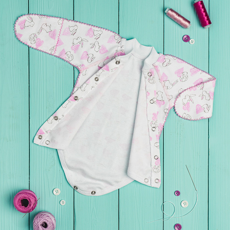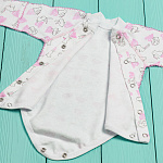 Боди удобно и легко надеть на ребёнка благодаря кнопкам-застёжкам по всей длине. Модель со швами наружу, которые не будут доставлять малышу неудобств. Рукава с отворотами-царапками. Проймы для ног отделаны кантом. Изделие из натуральной дышащей ткани.
