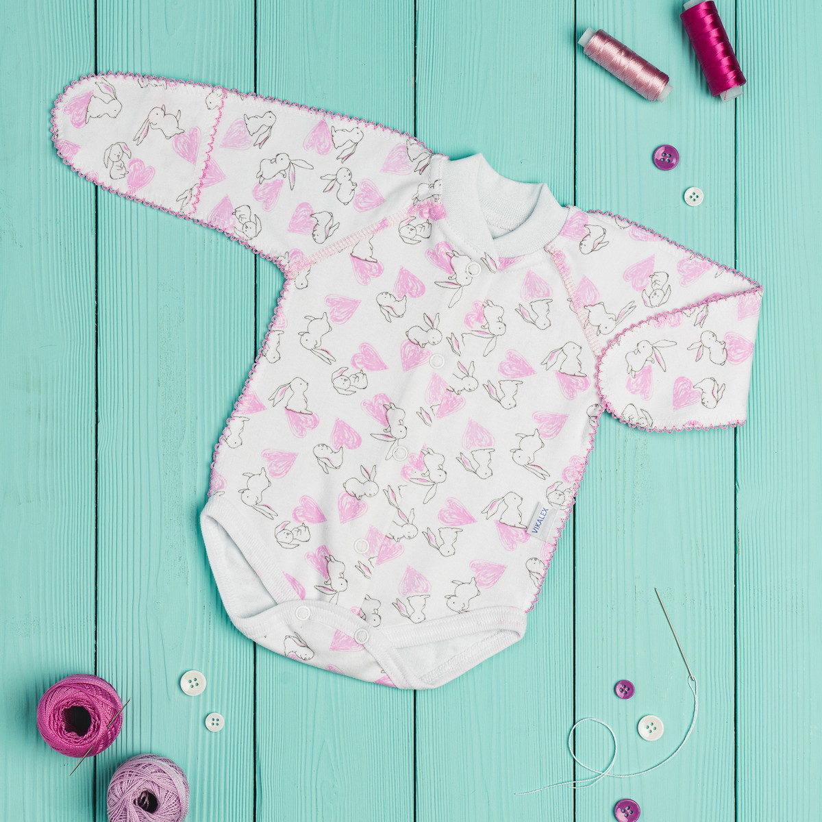 Боди удобно и легко надеть на ребёнка благодаря кнопкам-застёжкам по всей длине. Модель со швами наружу, которые не будут доставлять малышу неудобств. Рукава с отворотами-царапками. Проймы для ног отделаны кантом. Изделие из натуральной дышащей ткани.