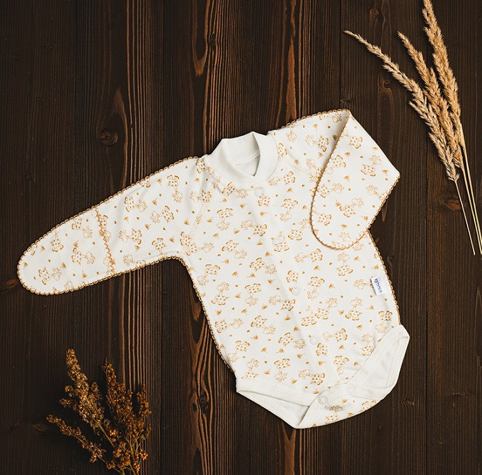Боди удобно и легко надеть на ребёнка благодаря кнопкам-застёжкам по всей длине. Модель со швами наружу, которые не будут доставлять малышу неудобств. Рукава с отворотами-царапками. Проймы для ног отделаны кантом. Изделие из натуральной дышащей ткани.