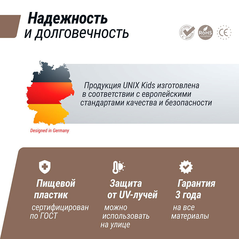 Игровые манежи для детей торговой марки UNIX Kids разработаны в Германии и изготовлены в соответствии с европейскими стандартами качества и безопасности. Материал, из которого состоят манежи, — пищевой пластик 4-го класса — согласно классификации ГОСТ, гипоаллергенный и абсолютно безвредный даже для самых маленьких пользователей.