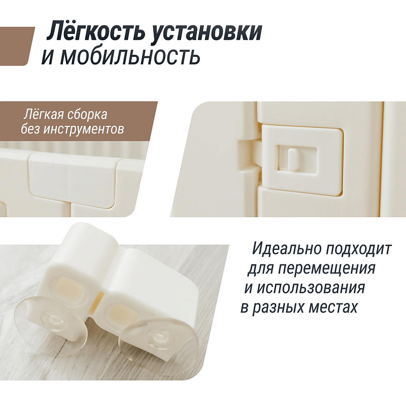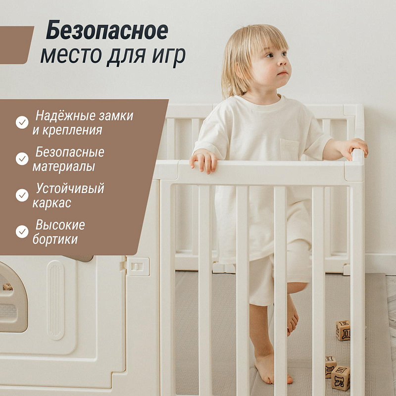 Все поверхности и высота манежа спроектированы таким образом, чтобы максимально обезопасить ребенка от ушибов. Надежная конструкция, специальный фиксатор двери (входа в манеж), прочные соединители секций, противоскользящие опоры и специальные присоски создают идеальные условия для комфортного и безопасного времяпрепровождения юных исследователей мира. Манеж легко хранить и перевозить, его сборка занимает 5-10 минут и не требует специальных инструментов. Приобретая игровой манеж UNIX Kids, вы создаете собственное уютное пространство для вашего малыша с заботой о его безопасности!