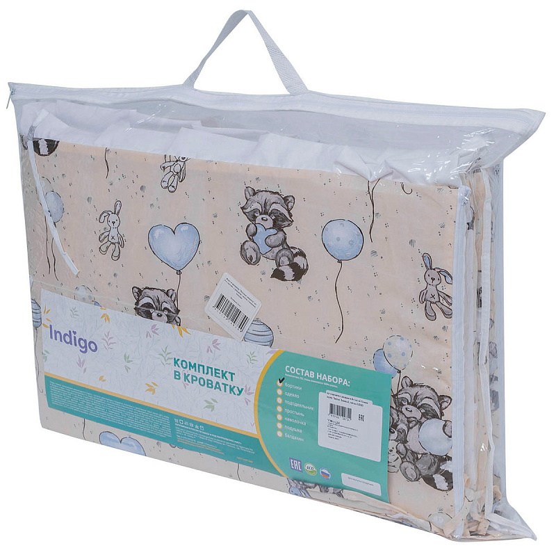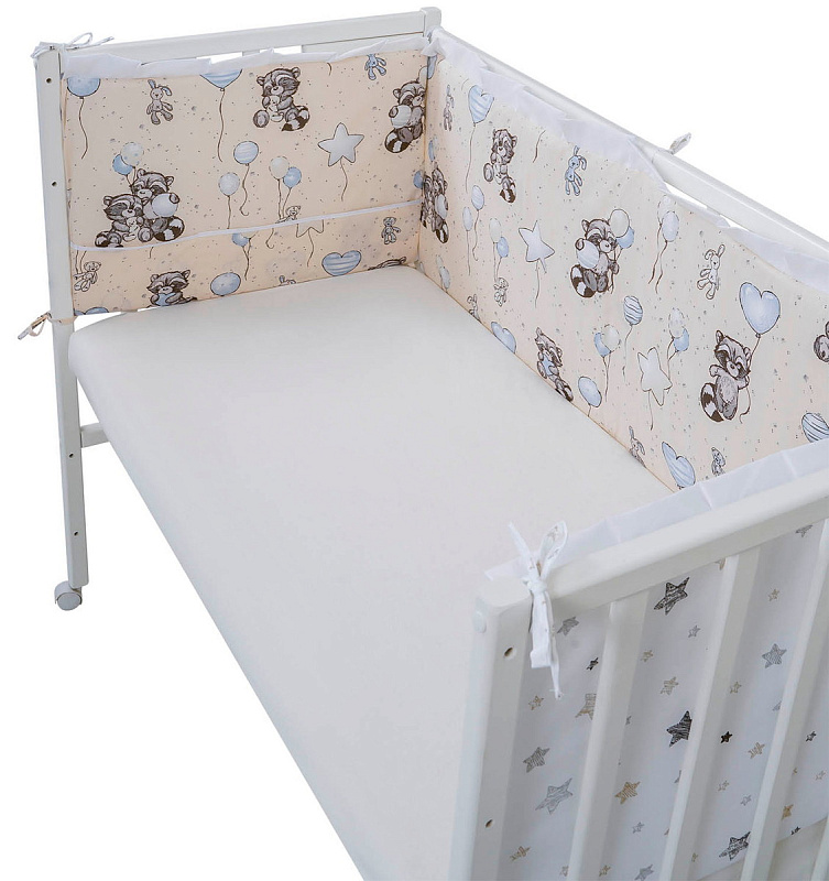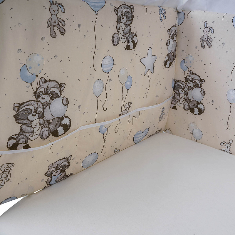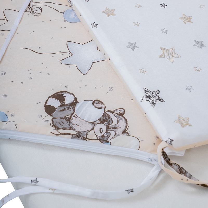 Борт в кроватку Indigo Лесные зверята из 4-х частей, с рюшкой, чехлы съемные, поплин бежевый енот