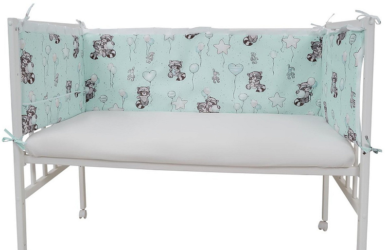 Борт в кроватку Indigo Лесные зверята из 4-х частей, с рюшкой, чехлы съемные, поплин голубой енот