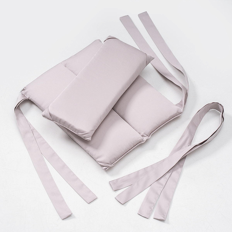 Для удобства использования бортики состоят из 4-х частей: 2 полуборта из 9-ти подушечек и две части из 4-х подушечек. В комплект дополнительно входят 2 части из 2-х и 1-ой подушечек. Элементы крепятся к кроватке лентами-завязками. Вы можете ставить в кроватку столько частей, сколько необходимо.