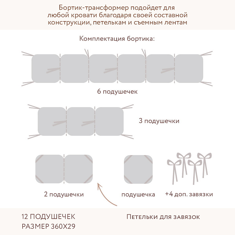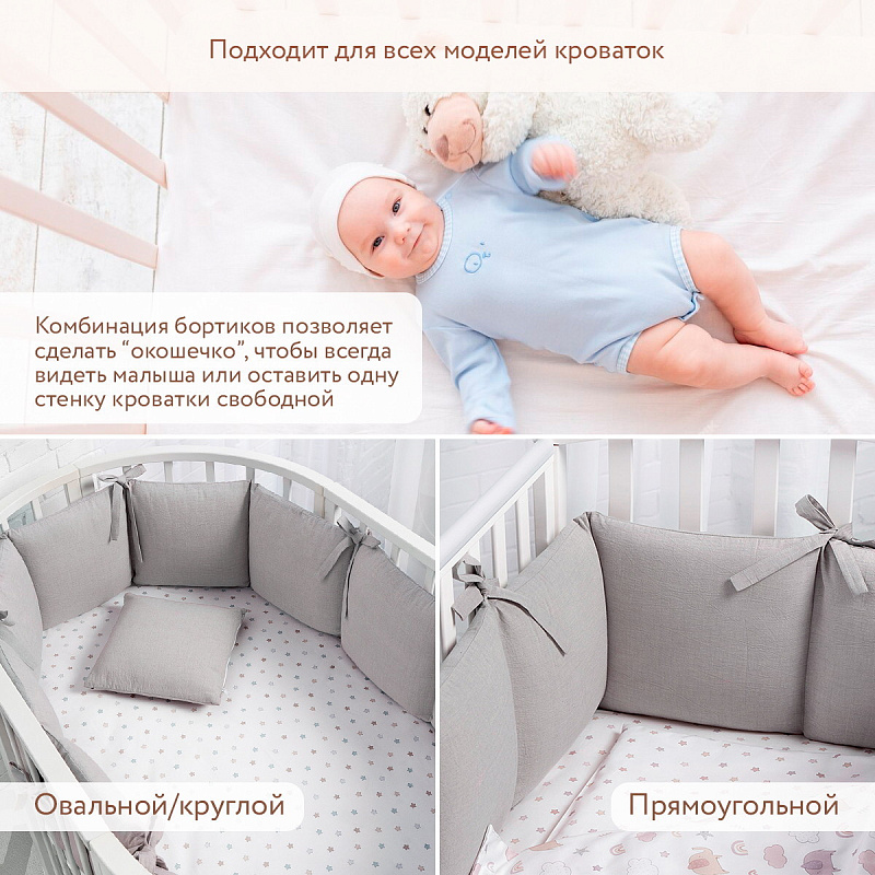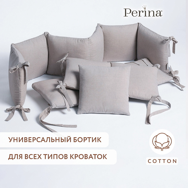 Новинка от Perina — нежные и практичные бортики, которые подойдут для любого спального места: прямоугольного, круглого или овального. Чехлы из натурального хлопка Eco Soft Cotton. Это очень мягкая разновидность хлопка, который отлично пропускает воздух и долго остается как новый даже после многократных стирок. Его секрет в специальном способе создания узора без окрашивания. Для удобства использования бортики состоят из 4-х частей: полуборт из 6-ти подушечек, одна отдельная и по одной части из 2-х и 3-х подушечек. Элементы крепятся к кроватке завязками. Вы можете ставить в кроватку столько частей, сколько захотите, а отдельную подушечку можно использовать не только как защиту, но и как отдельный элемент. Для дополнительного удобства каждая часть бампера имеет съемный чехол на молнии. Теперь вы можете стирать только внешнюю часть бампера, не затрагивая наполнитель. А внутри бампера — экологически чистый, гипоаллергенный и легкий материал Hollcon (Холлкон). Он прекрасно сохраняет форму, не слеживается, даже когда малыш начинает активно передвигаться в кроватке.