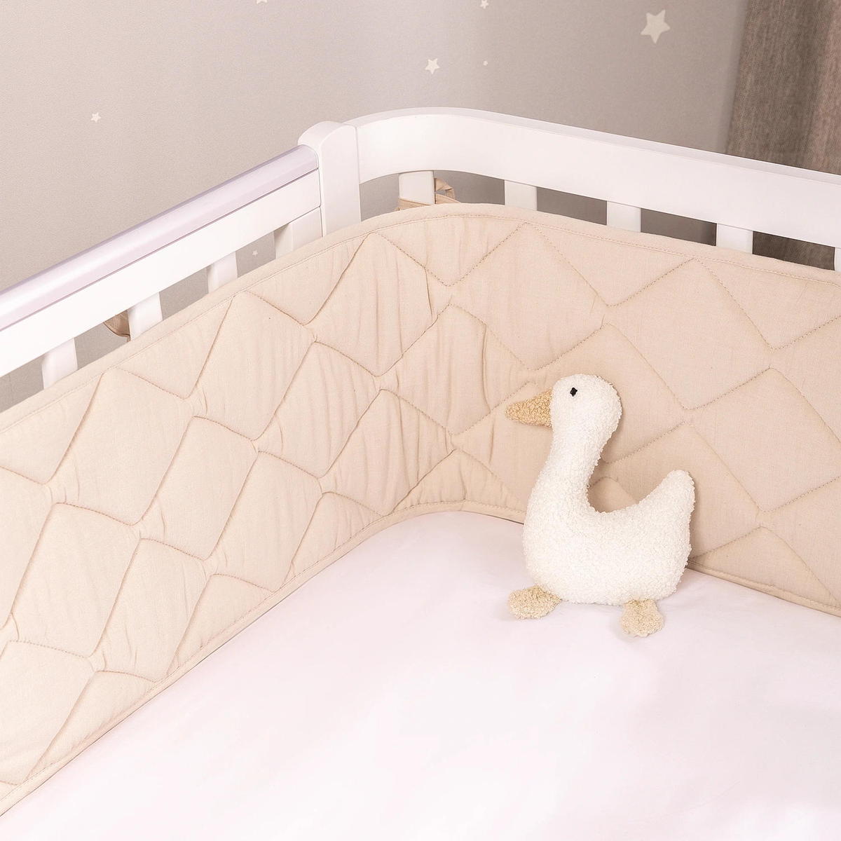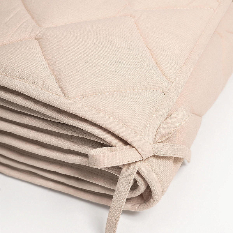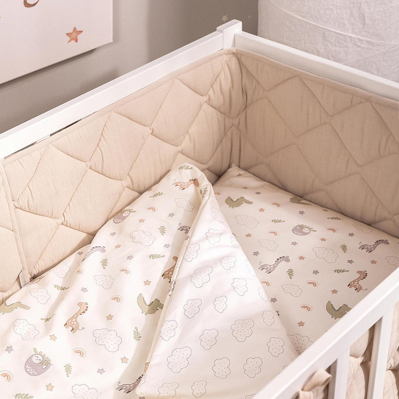 Стеганая структура делает бортики плотными и упругими, но при этом гибкими, чтобы легко принять нужную форму по периметру кроватки. Они хорошо защищают малыша от сквозняков, застреваний, случайных ударов и создают уютную атмосферу для спокойного сна.