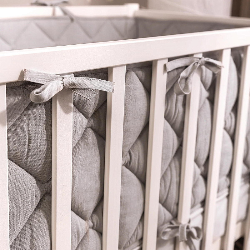 Стеганая структура делает бортики плотными и упругими, но при этом гибкими, чтобы легко принять нужную форму по периметру кроватки. Они хорошо защищают малыша от сквозняков, застреваний, случайных ударов и создают уютную атмосферу для спокойного сна.