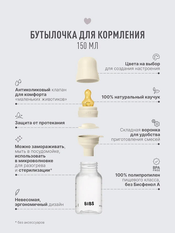 Долгожданная новинка от BIBS в наборе из невесомой версии бутылочки для кормления, воронки, кольца против протекания и латексной соски. Бутылочку из премиального полипропилена очень удобно держать в маленьких ручках благодаря низкому весу. Её эргономичная форма позволит ребёнку чувствовать себя максимально комфортно во время кормления. Теперь стеклянную бутылочку BIBS можно оставить дома, а в дорогу или на прогулку брать невесомую версию бутылочки из полипропилена. Чтобы помочь родителям сэкономить время на подготовке детского питания, форма бутылочки совместима с аппаратами для приготовления молочной смеси. Привлекательная стоимость новинки приятно удивит своей доступностью. Бутылочка на 100% выполнена из пищевых материалов. Не содержит бисфенол А и другие вредные примеси. Продукт соответствует европейским стандартам качества.