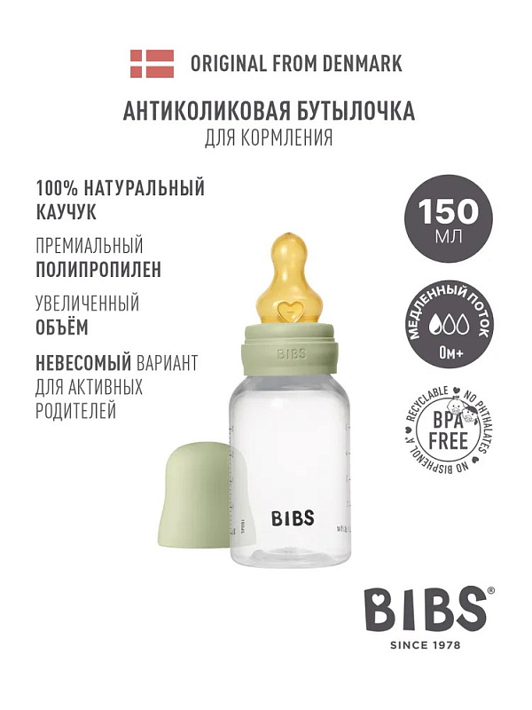 Бутылочка для кормления Bibs с латексной соской, медленный поток, 150 мл 5016250 Sage
