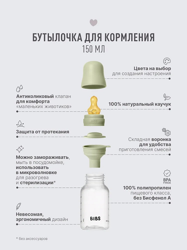 Долгожданная новинка от BIBS в наборе из невесомой версии бутылочки для кормления, воронки, кольца против протекания и латексной соски. Бутылочку из премиального полипропилена очень удобно держать в маленьких ручках благодаря низкому весу. Её эргономичная форма позволит ребёнку чувствовать себя максимально комфортно во время кормления. Теперь стеклянную бутылочку BIBS можно оставить дома, а в дорогу или на прогулку брать невесомую версию бутылочки из полипропилена. Чтобы помочь родителям сэкономить время на подготовке детского питания, форма бутылочки совместима с аппаратами для приготовления молочной смеси. Привлекательная стоимость новинки приятно удивит своей доступностью. Бутылочка на 100% выполнена из пищевых материалов. Не содержит бисфенол А и другие вредные примеси. Продукт соответствует европейским стандартам качества.