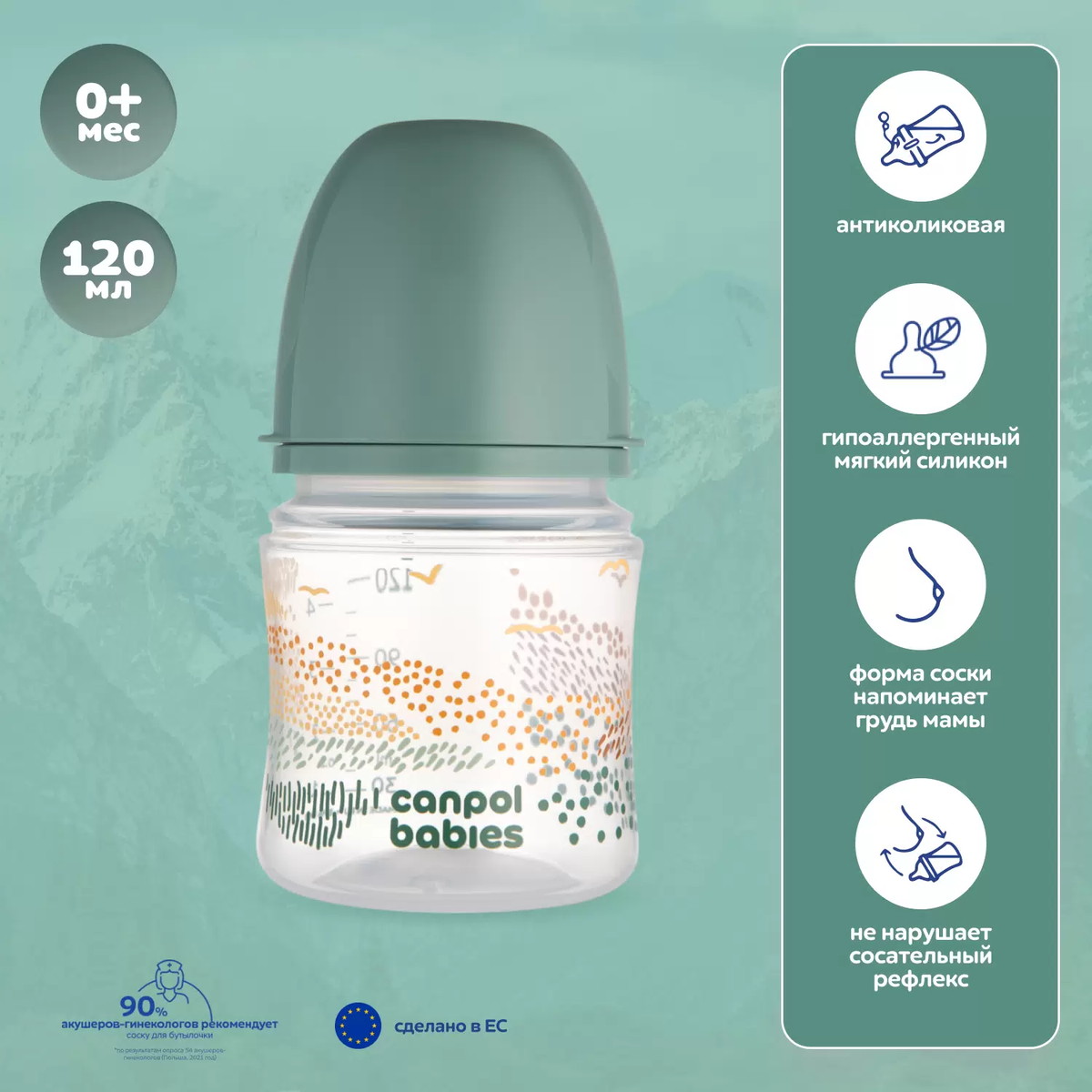 Антиколиковая детская бутылочка для кормления новорожденных 0 120 мл Canpol babies коллекции Mountains была создана специально для детей с первых дней жизни. Гарантия легкого начала грудного вскармливания - бутылка для воды, смеси и молока позволяет сочетать грудное вскармливание и кормление из бутылочки. Эффективный антиколиковый клапан. Предотвращает образование пузырьков воздуха в пище, спасает от коликов и чрезмерного скопления газов. Широкое горлышко. Позволяет легко промывать и наполнять бутылочку. Удобная стерилизация. Бутылочку можно простерилизовать в микроволновой печи. Мягкая силиконовая соска. Исключительно мягкий гипоаллергенный силикон не раздражает нежные десна новорожденного малыша. Имитирует грудь мамы. Новорожденным будет легко держать бутылочку в руках благодаря её эргономичной форме. С точной и четкой мерной шкалой. Облегчает процесс приготовления пищи. Исключительно безопасные материалы. Интересный современный дизайн. Детские бутылки Canpol babies не содержат Бисфенол А. Подходит для маленьких детей от 0 месяцев, а также 3, 6, 12 (1 годик) при смене соски. Бренд рекомендует грудное вскармливание, как самую здоровую форму кормления. Мы рекомендуем начинать давать молоко в альтернативной форме только после консультации с врачом, когда грудное вскармливание невозможно или недостаточно. Рекомендации по использованию: Перед каждым использованием промойте все части бутылочки для кормления и продезинфицируйте их: поместите на 5 минут в кипящую воду. Это делается для обеспечения гигиены. Кипячение и жесткая вода могут создать эффект известкового налета. Тщательно промойте все детали чистой водой. Бутылочку можно мыть в посудомоечной машине (максимальная температура 65 ), но без соски - жесткие химикаты/моющие средства могут повредить её. Не используйте никаких антибактериальных средств. Не затягивайте стопорное кольцо бутылочки, так как это может нарушить вентиляцию соски. Не увеличивайте отверстия для подачи жидкости, так как это может повредить соску. Будьте осторожны при подогреве в микроволновой печи. Всегда перемешивайте пищу, чтобы обеспечить равномерное распределение температуры, проверяйте температуру жидкости, прежде чем давать ее ребенку. Разогревая пищу в микроволновой печи, не забудьте оставить бутылку открытой. Не ставьте изделие в горячую духовку и не разогревайте на газовой/электрической плите. *Бутылочка совместима с молокоотсосами Canpol babies. *Европейское качество. Сделано в Польше.
