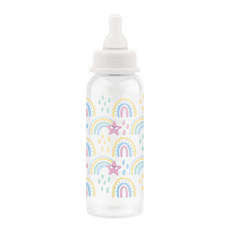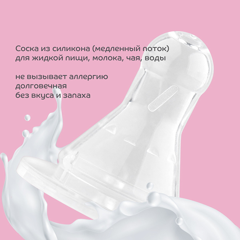 Бутылочка для кормления со стандартным (узким) горлышком оснащена силиконовой молочной соской медленного потока. Выполнена из безопасного материала - полипропилена. Такие бутылочки легкие, не бьются. Силиконовые соски упругие, что способствует развитию жевательного аппарата, не вызывают аллергию. Выпуклая, нестираемая шкала имеет удобный шаг в 30 мл.