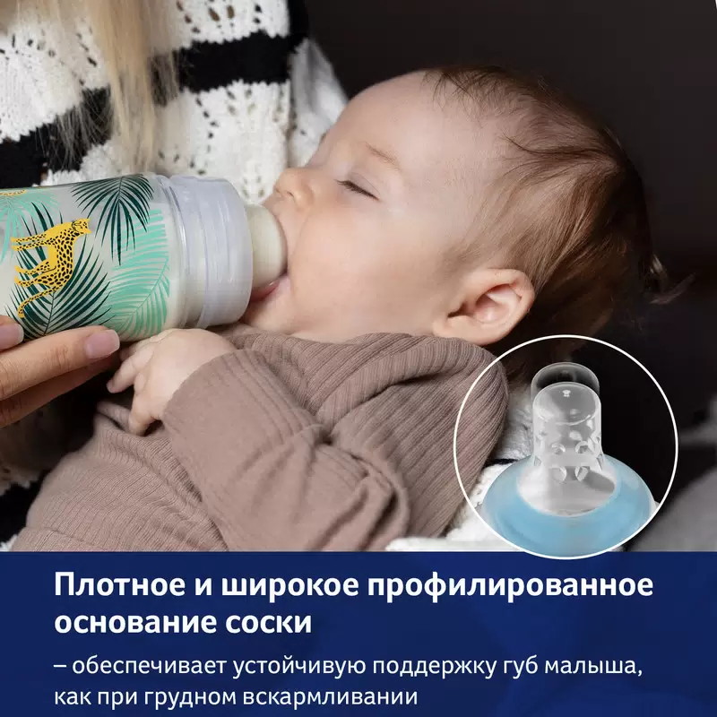 Антиколиковая бутылочка с широким горлом для кормления Lovi коллекции Jungle Vibes с динамической соской была создана специально для новорожденных от 0 месяцев и малышей постарше. Гарантия легкого начала грудного вскармливания; позволяет сочетать грудное вскармливание и кормление из бутылочки. Детская бутылка для воды, молока и смеси оснащена уникальной динамической соской из тонкого силикона, с жестким профилированным основанием и системой отвода воздуха Super Vent. Эффективный антиколиковый клапан (система вентиляции Super Air) предотвращает образование пузырьков воздуха в пище, спасает от коликов и чрезмерного скопления газов. Твердое профилированное основание соски изготовлено из более толстого слоя силикона, предотвращает жевание соски. Контурная форма и соответствующая ширина основания обеспечивают правильное расположение губ детей. Широкое горлышко позволяет легко промывать и наполнять детские бутылки Lovi. Эргономичная моделированная форма обеспечит комфорт во время кормления малыша. Мягкая силиконовая соска на бутылку - гипоаллергенный силикон не раздражает нежные десна малыша. Динамическая соска стимулирует развитие сосательного рефлекса, способствуя развитию мышц лица. Расширяется и сжимается в такт сосательным движениям новорожденного ребенка. Имитирует грудь мамы. Не содержит Бисфенол А. Рекомендация доктора медицинских наук неонатолога: бутылочки для маленьких детей всегда должны быть высококачественными, изготовленными из безопасных протестированных и сертифицированных материалов. Еще одной важной характеристикой является эффективная система циркуляции воздуха. На все это очень серьезно влияет выбор соски для бутылочки.Можно использовать в микроволновой печи.Не рекомендуется мыть в посудомоечной машине.