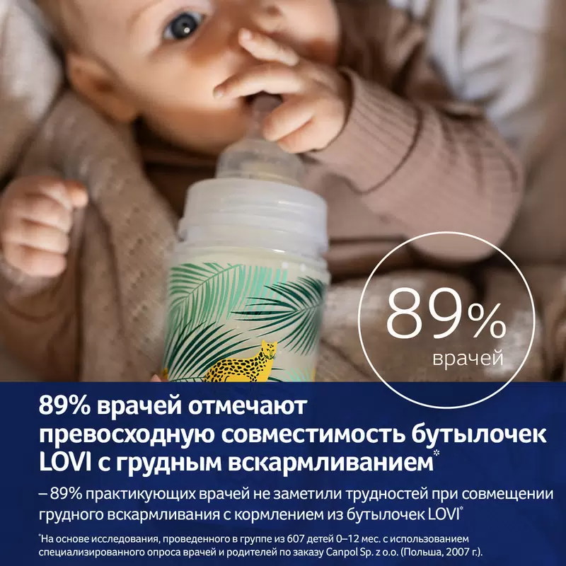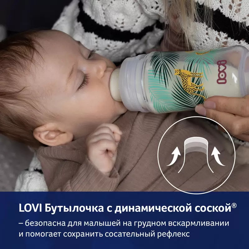 Антиколиковая бутылочка с широким горлом для кормления Lovi коллекции Jungle Vibes с динамической соской была создана специально для новорожденных от 0 месяцев и малышей постарше. Гарантия легкого начала грудного вскармливания; позволяет сочетать грудное вскармливание и кормление из бутылочки. Детская бутылка для воды, молока и смеси оснащена уникальной динамической соской из тонкого силикона, с жестким профилированным основанием и системой отвода воздуха Super Vent. Эффективный антиколиковый клапан (система вентиляции Super Air) предотвращает образование пузырьков воздуха в пище, спасает от коликов и чрезмерного скопления газов. Твердое профилированное основание соски изготовлено из более толстого слоя силикона, предотвращает жевание соски. Контурная форма и соответствующая ширина основания обеспечивают правильное расположение губ детей. Широкое горлышко позволяет легко промывать и наполнять детские бутылки Lovi. Эргономичная моделированная форма обеспечит комфорт во время кормления малыша. Мягкая силиконовая соска на бутылку - гипоаллергенный силикон не раздражает нежные десна малыша. Динамическая соска стимулирует развитие сосательного рефлекса, способствуя развитию мышц лица. Расширяется и сжимается в такт сосательным движениям новорожденного ребенка. Имитирует грудь мамы. Не содержит Бисфенол А. Рекомендация доктора медицинских наук неонатолога: бутылочки для маленьких детей всегда должны быть высококачественными, изготовленными из безопасных протестированных и сертифицированных материалов. Еще одной важной характеристикой является эффективная система циркуляции воздуха. На все это очень серьезно влияет выбор соски для бутылочки.Можно использовать в микроволновой печи.Не рекомендуется мыть в посудомоечной машине.