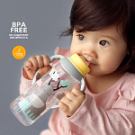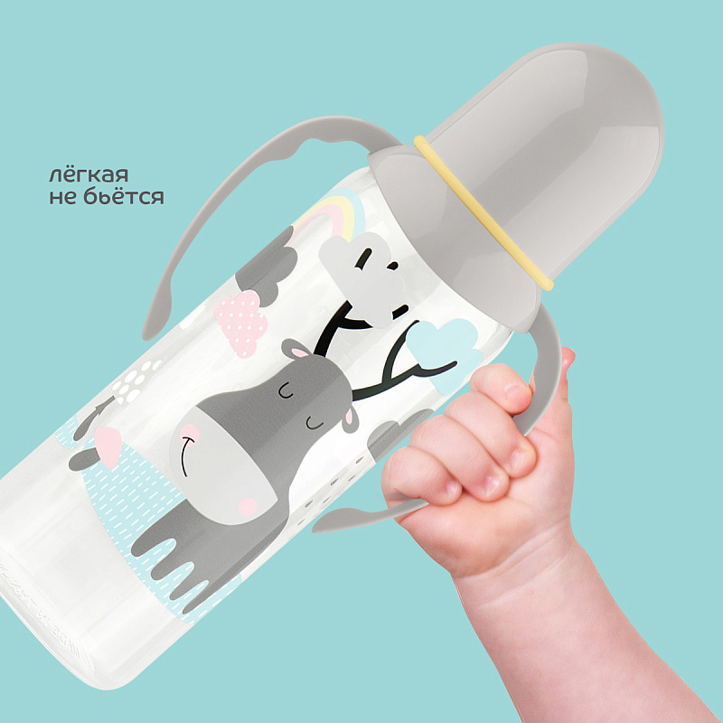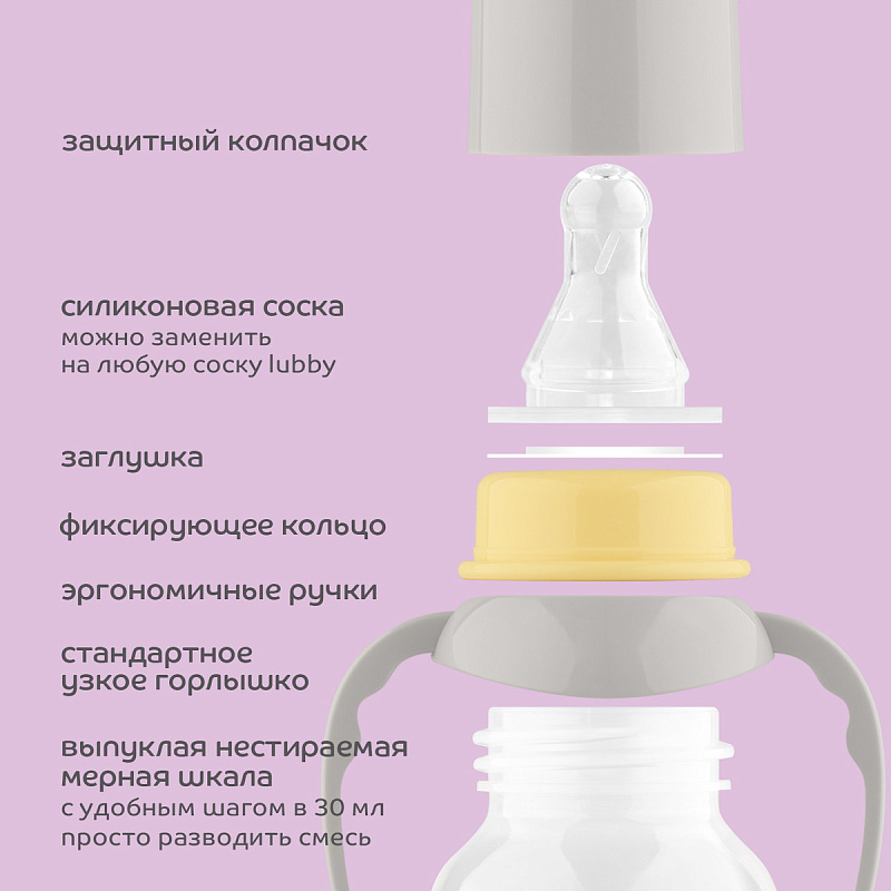 В комплект входит заглушка, позволяющая использовать бутылочку как контейнер. Благодаря ручкам ребенок может самостоятельно держать бутылочку во время кормления. При необходимости ручки можно снять. К бутылочке подходят все молочные соски lubby как латексные, так и силиконовые для бутылочек со стандартным (узким) горлышком.