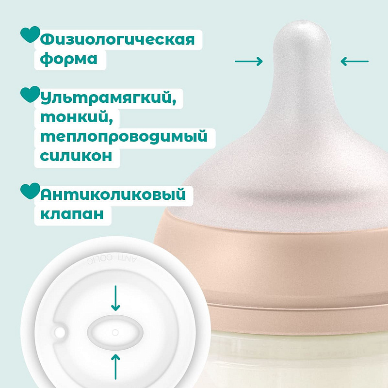 Специальный антиколиковый клапан уравновешивает давление внутри и снаружи бутылочки, что помогает снизить возникновение коликов.