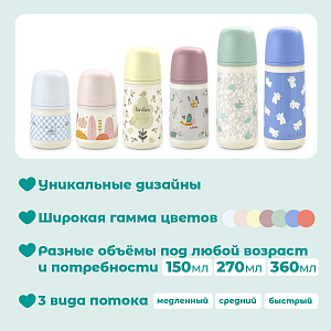 Они доступны в разных объемах, подходящих для малышей разного возраста и с учетом их потребностей. Родители могут подобрать бутылочку с одним из трех видов потока, что гарантирует комфортное кормление на всех этапах развития ребёнка.