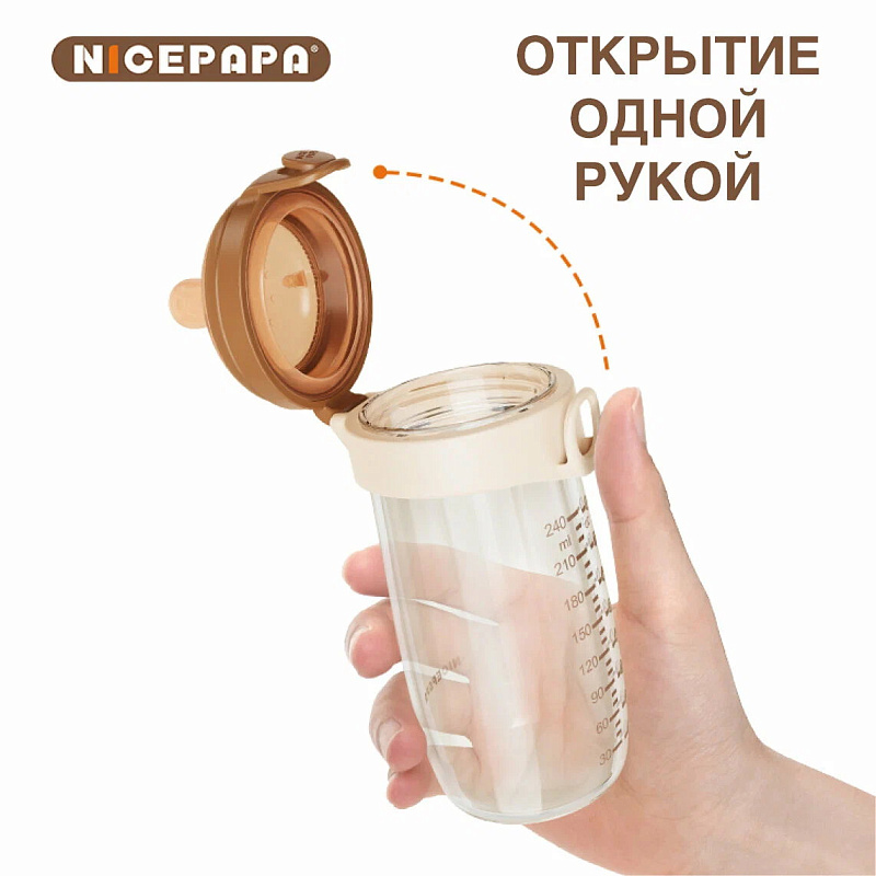 Бутылочка для кормления с откидной крышкой и собственным запатентованным дизайном, которую можно открыть одной рукой и мгновенно приготовить сухое молоко. По сравнению с традиционной детской бутылочкой, крышка и корпус бутылочки соединены вместе, такая конструкция не только сокращает количество операций, но и перед приготовлением молока крышку не обязательно класть на стол. В отличие, от обычного способа открывания крышки с закручиванием, в данном случае основное внимание уделяется откидному колпачку, который позволяет управлять им одной рукой, чтобы вы могли утешать ребенка или выполнять многозадачную работу другой рукой.