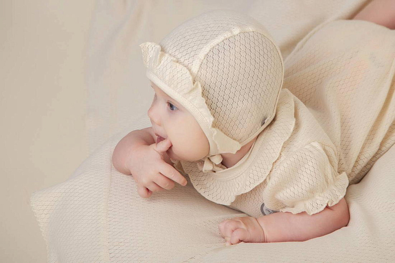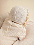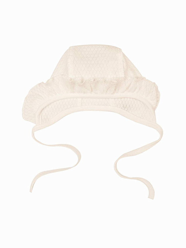 Нежный чепчик с отделкой в виде рюши, выполнен из натуральной ажурной ткани рибана. Превосходный головной убор для летних прогулок.