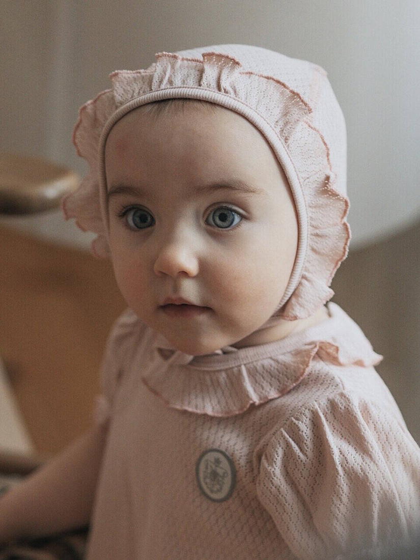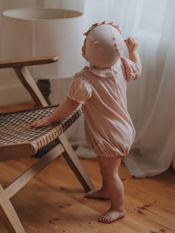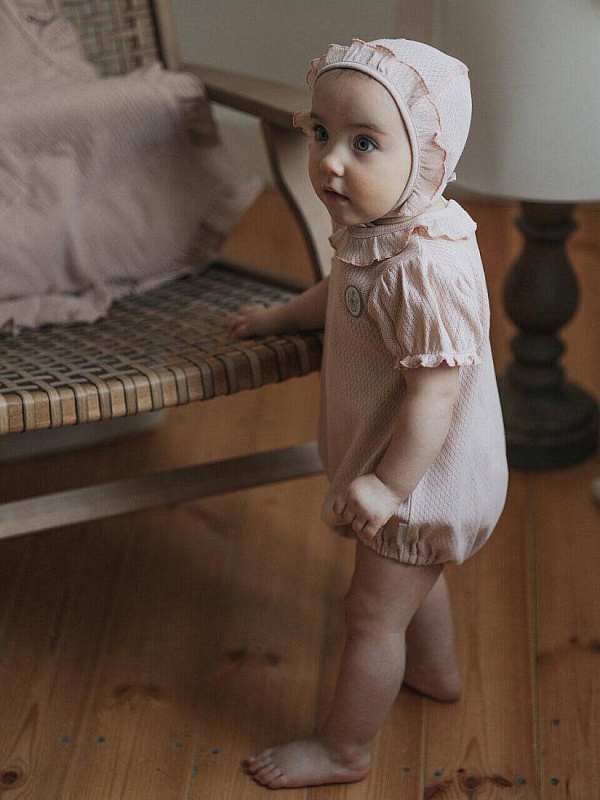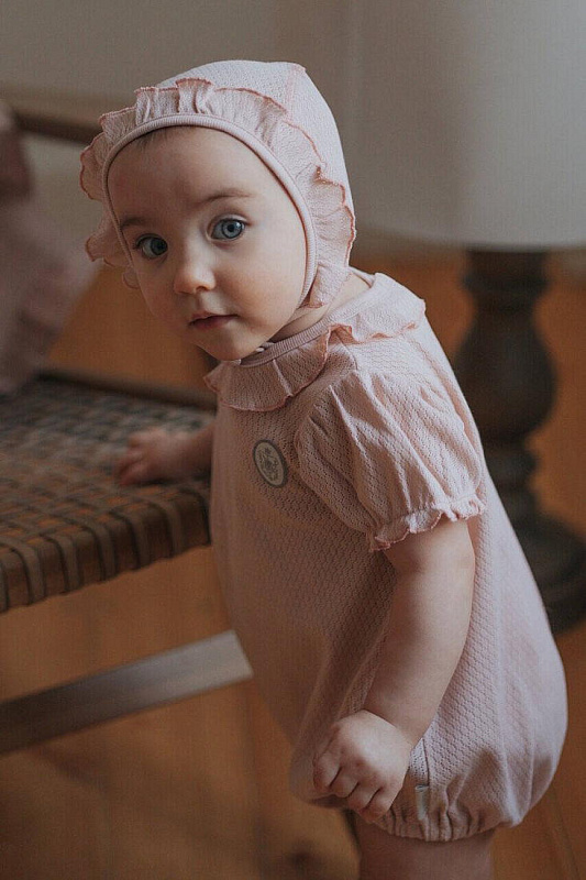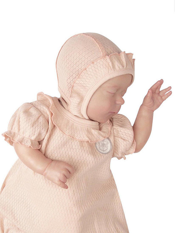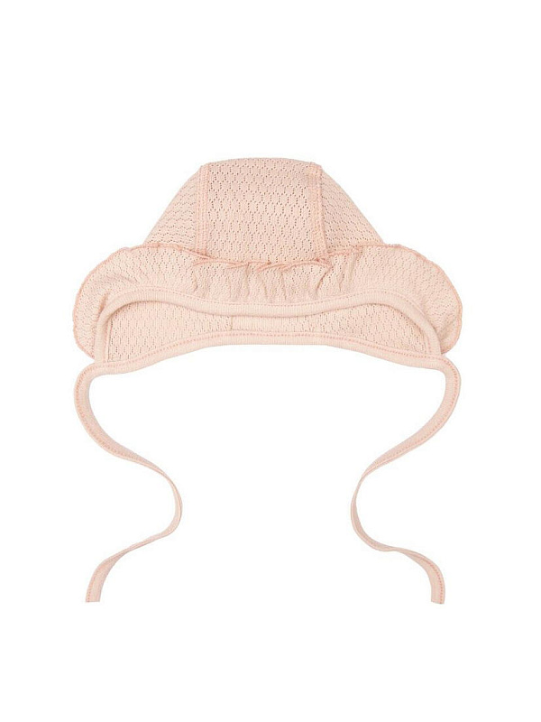 Нежный чепчик с отделкой в виде рюши, выполнен из натуральной ажурной ткани рибана. Превосходный головной убор для летних прогулок.