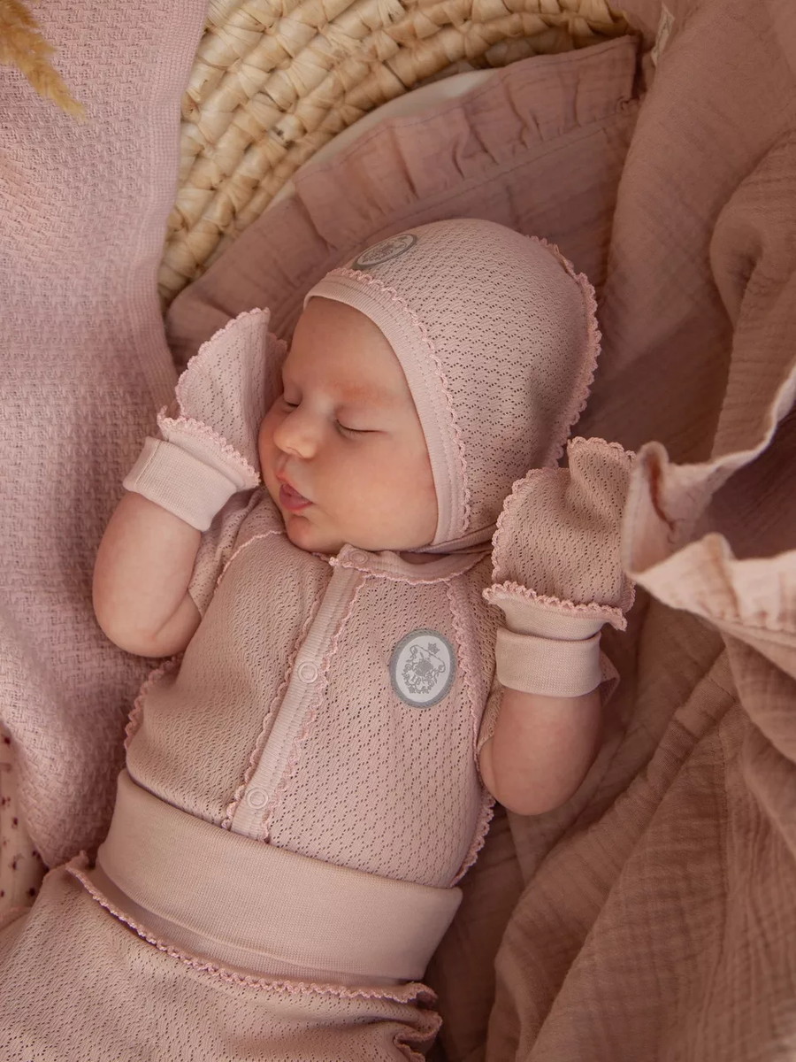 Нежнейший чепчик подарит малышу комфорт и удобство с первых дней жизни. Чепчик изготовлен из натурального хлопка, приятного к телу и абсолютно безопасного для грудного ребенка. Чепчик выполнен швами наружу, что предотвращает натирание головки. Мягкий чепчик защищает родничок, сохраняет тепло и создаёт комфорт для сна и активности малыша. Удобные завязочки позволяют чепчику регулировать посадку по голове и не сползать на глаза. Чепчик оберегает голову и ушки младенца от переохлаждения и сквозняков.