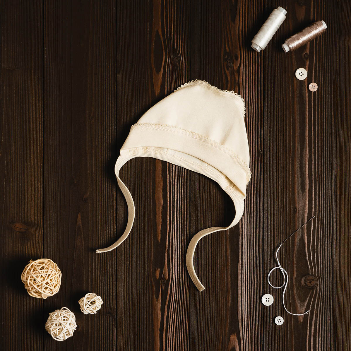 Чепчик выполнен из натуральной дышащей ткани. Модель с удобными завязочками, которые не будут натирать нежную кожу малыша. Швы наружу не придают дискомфорта. Ткань хорошо пропускает воздух благодаря натуральному составу.
