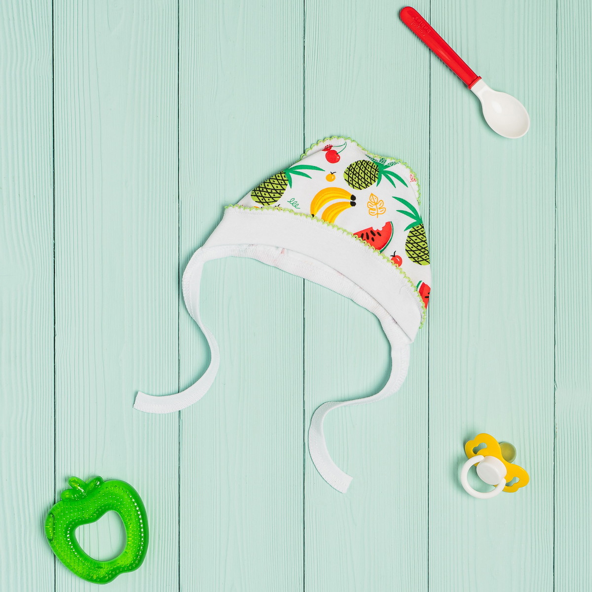 Чепчик с удобными завязочками, которые не будут натирать нежную кожу малыша. Изделие выполнено из натуральной дышащей ткани и украшено рисунками.