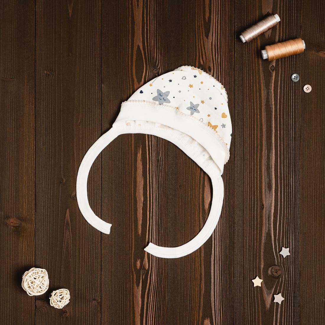 Чепчик выполнен из утепленного футера. Модель с удобными завязочками, которые не будут натирать нежную кожу малыша. Швы наружу не придают дискомфорта. Ткань хорошо пропускает воздух благодаря натуральному составу ткани.