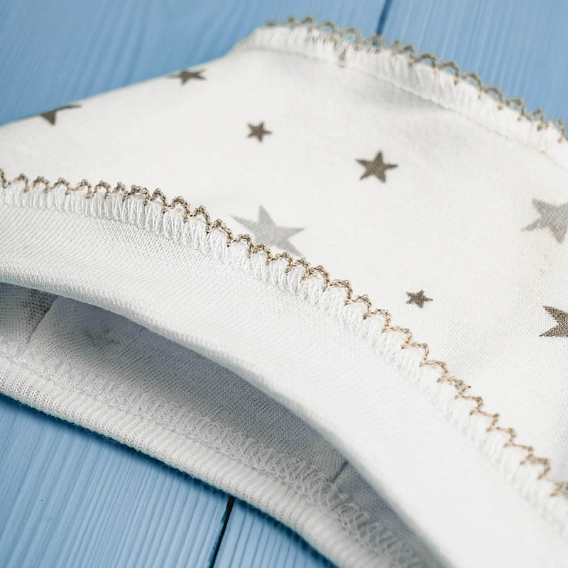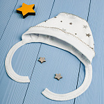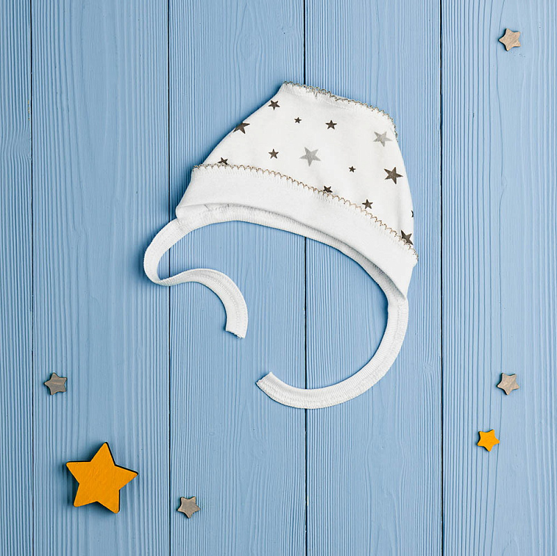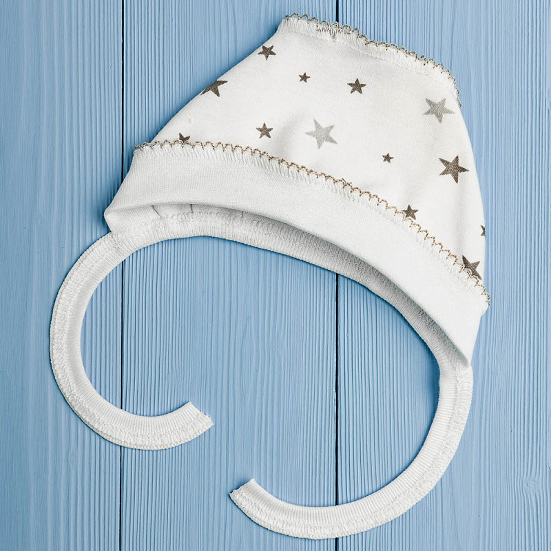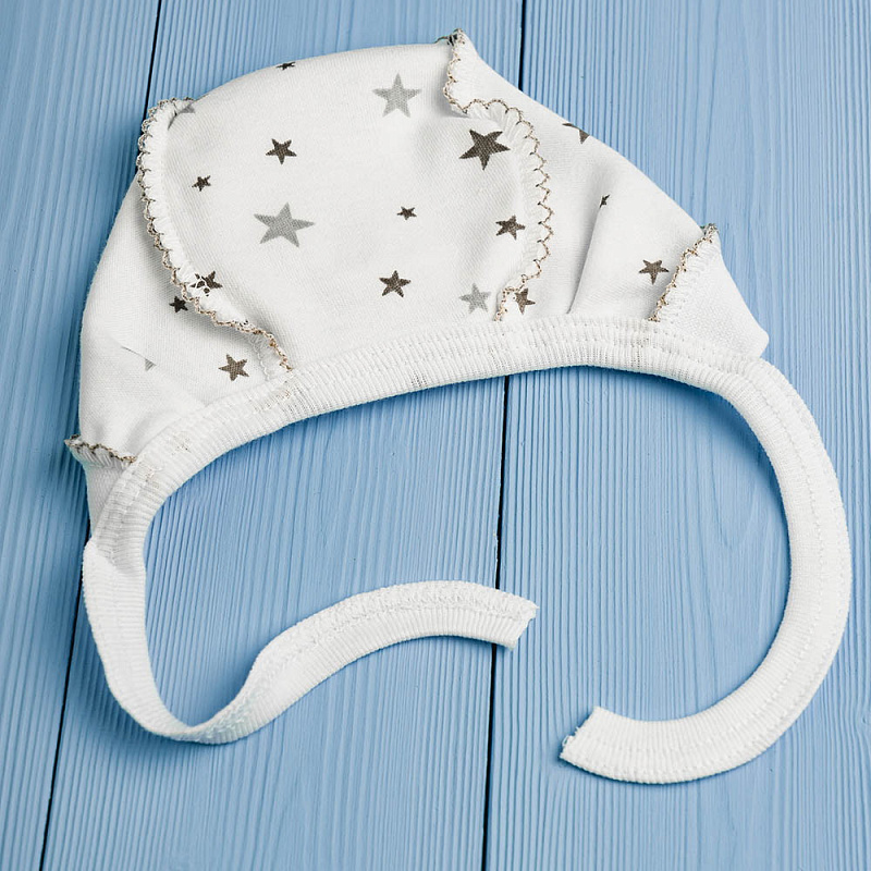 Чепчик выполнен из натуральной дышащей ткани и украшен рисунками. Модель с удобными завязочками, которые не будут натирать нежную кожу малыша. Швы наружу не придают дискомфорта. Ткань хорошо пропускает воздух благодаря натуральному составу.