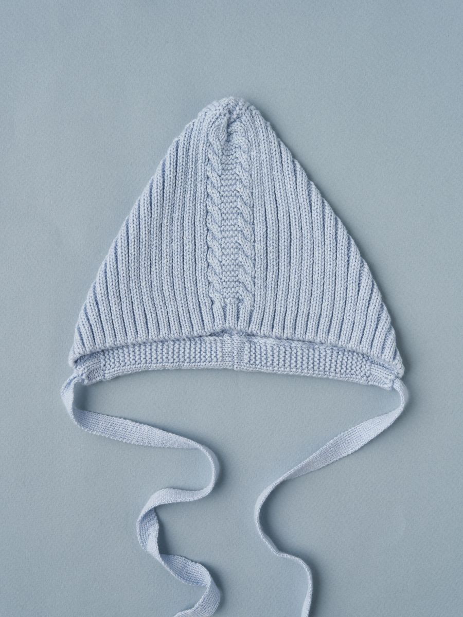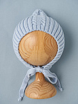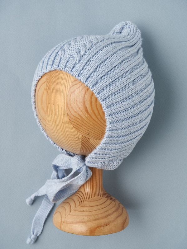 Чепчик с завязками выполнен из смесовой пряжи с хлопком, шерстью мериноса и ПАН-ом. Хлопок придает нежность, шерсть делает ее мягкой и теплой, а ПАН - неприхотливой в уходе.