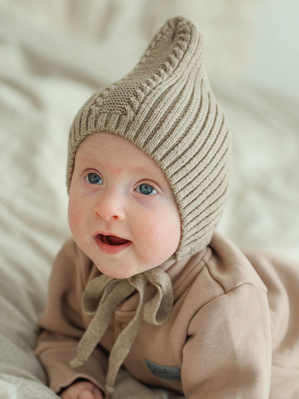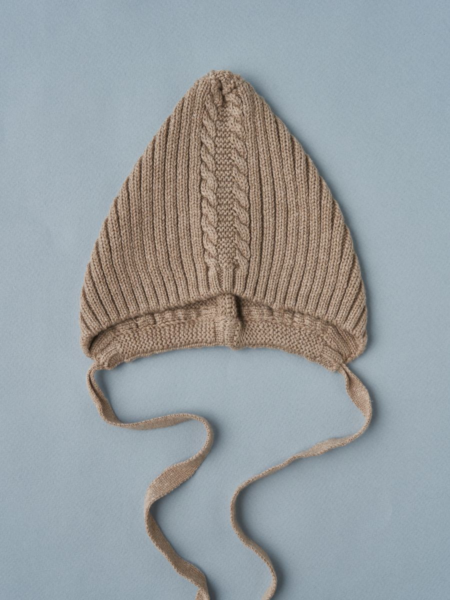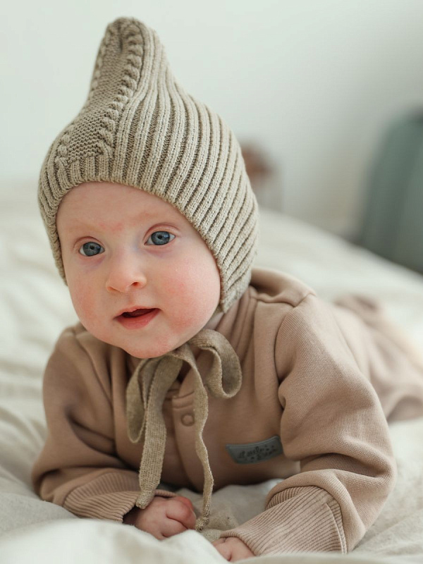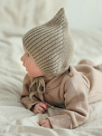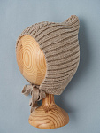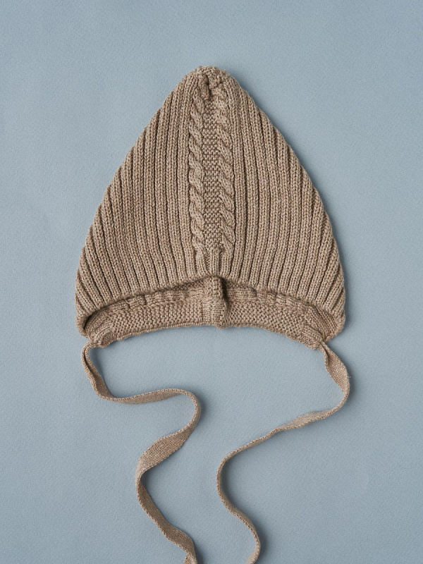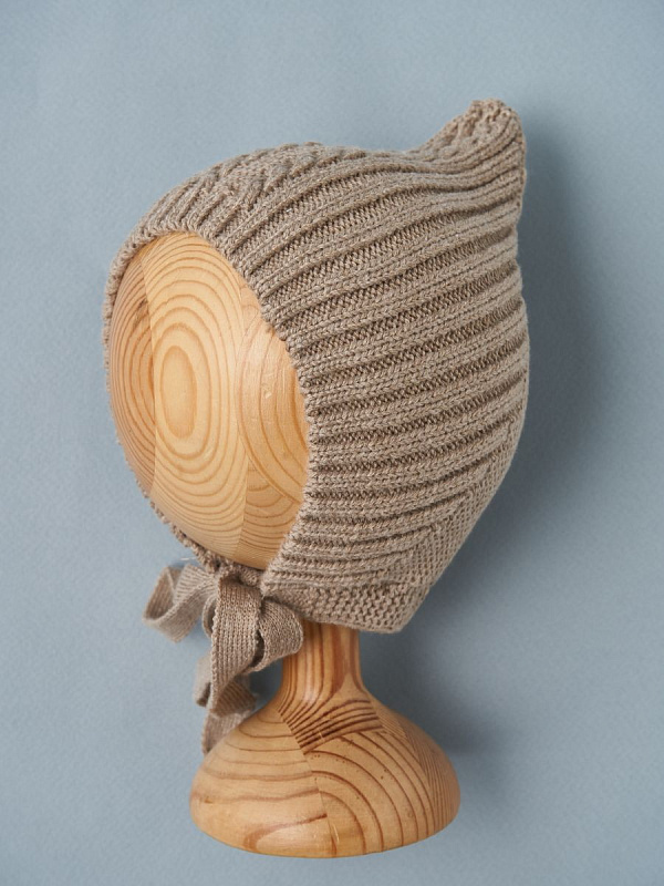 Чепчик с завязками выполнен из смесовой пряжи с хлопком, шерстью мериноса и ПАН-ом. Хлопок придает нежность, шерсть делает ее мягкой и теплой, а ПАН - неприхотливой в уходе.