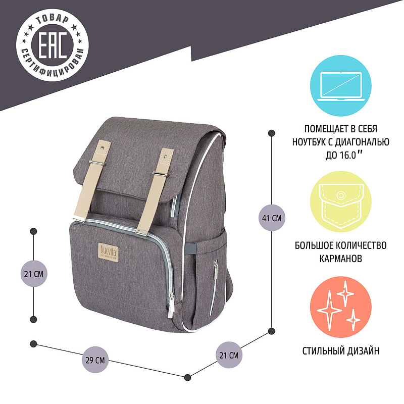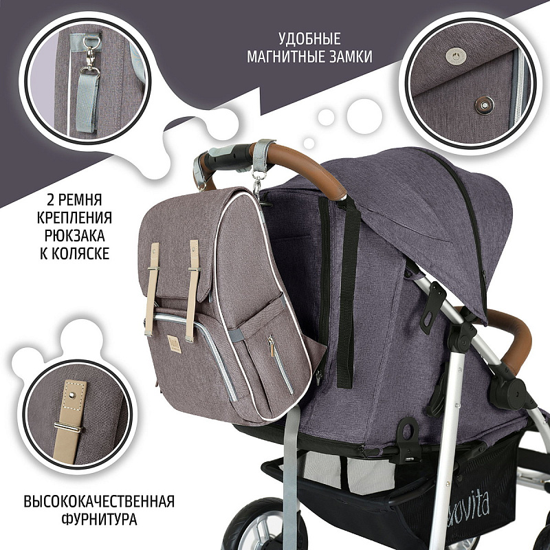 - Этот элегантный рюкзак для мамы имеет анатомическую форму и небольшой вес. Лямки с регулировкой и мягкими накладками снижают нагрузку на спину.