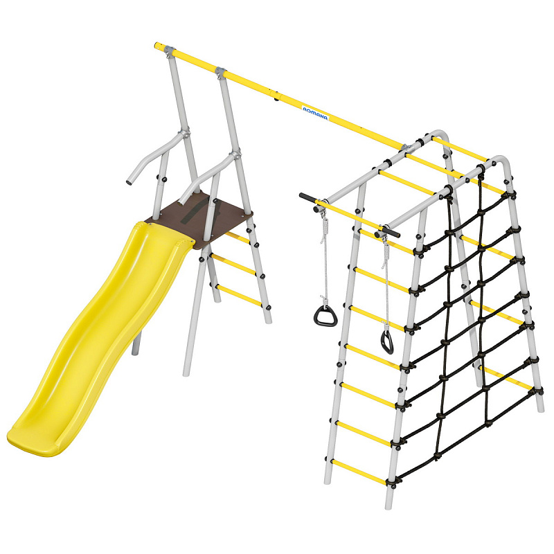 Дачный спортивный комплекс нового поколения ROMANA «Богатырь» — настоящая находка для активных и подвижных детей. Прекрасное приобретение для дачи или загородного дома. Маленький искатель приключений будет просто в восторге, а родители cмогут любоваться как малыш растет, крепнет и превращается в самого настоящего богатыря! В дачном комплексе предусмотрена удобная и безопасная горка. Другая часть комплекса состоит из лестницы и турника, а также канатного лаза, сделанного из шнура повышенной прочности. В комплекте также предусмотрены гимнастические кольца. Все навесное оборудование выполнено из атмосферостойких материалов — в летнее время их можно не убирать в дом после занятий. Приключения обещают быть захватывающими! Конструкция комплекса прочная и выдерживает человека весом 100 кг (нагрузка при испытаниях комплекса — 200 кг). Дачный комплекс ROMANA «Богатырь» достаточно компактный и не займет много места на придомовом участке. ROMANA «Богатырь» — отличный выбор для родителей, которые хотят занять своих домочадцев активными играми на лоне природы!