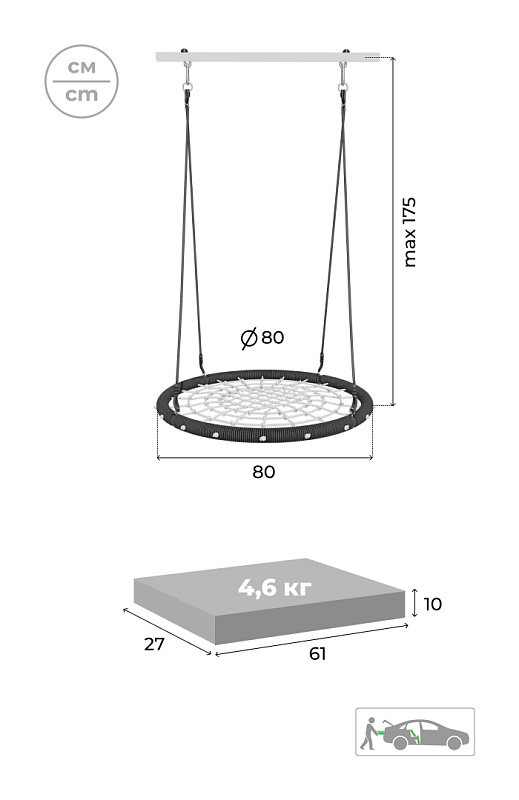 В наборегорка, кольца, веревочный лаз, гимнастическая лестница, неподвижный турник, качели гнездо сетка 80 см