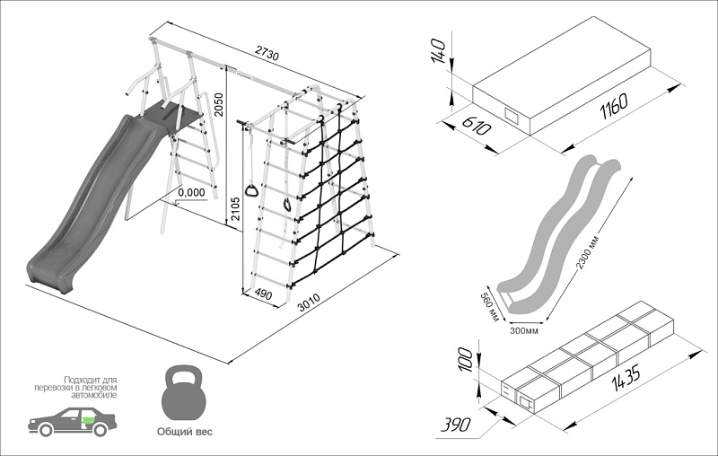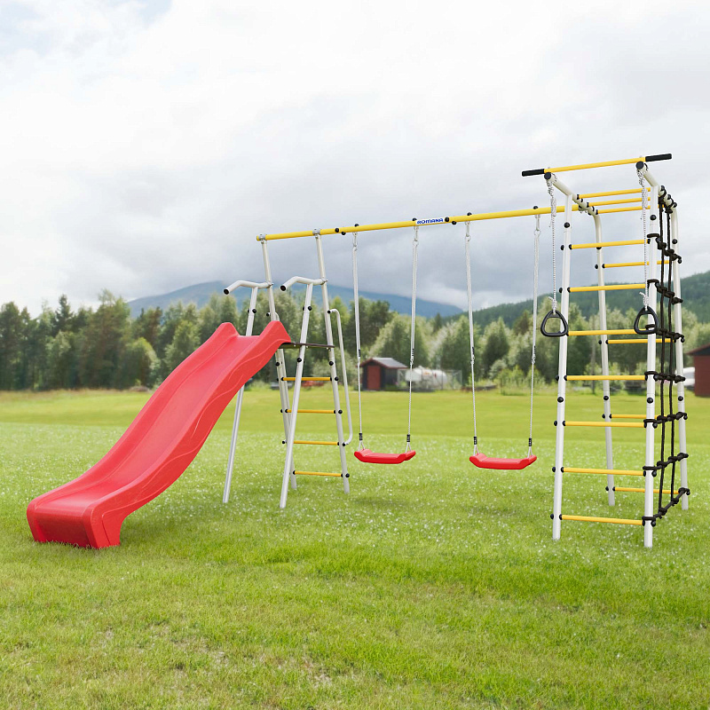 В наборегорка, кольца, веревочный лаз, гимнастическая лестница, рукоход, неподвижный турник, качели пластиковые