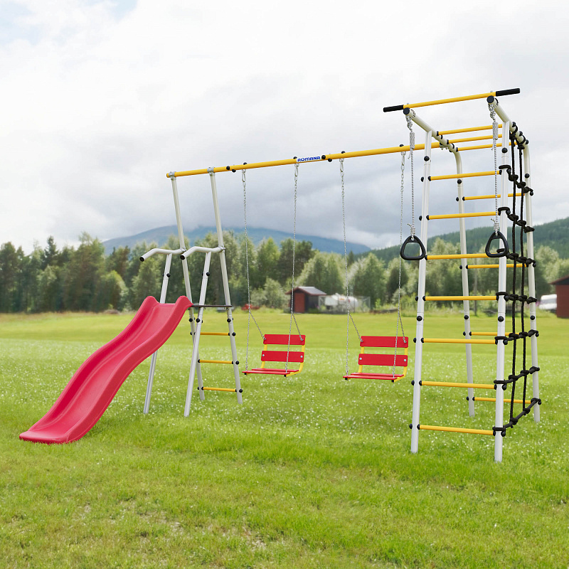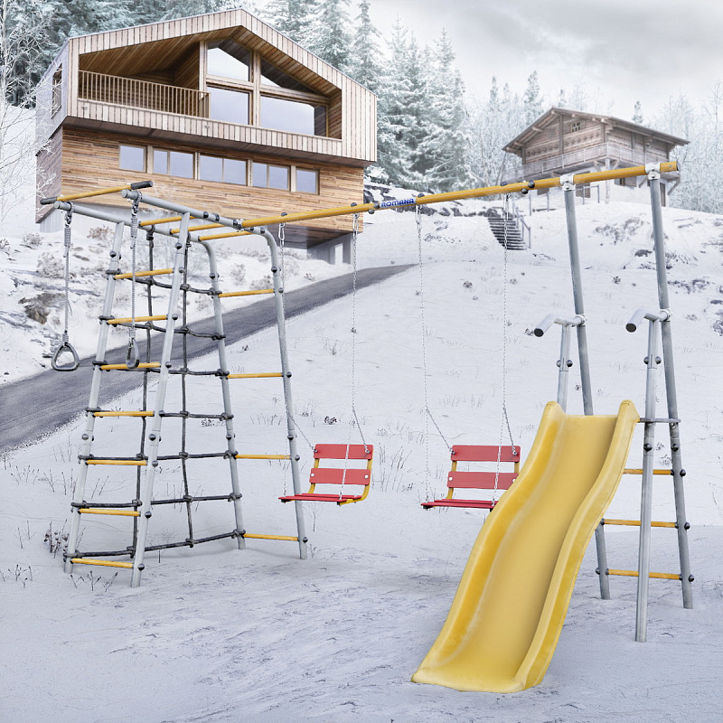 В наборегорка, кольца, сетка веревочного лаза, гимнастическая лестница, рукоход, турник неподвижный, качели цепные