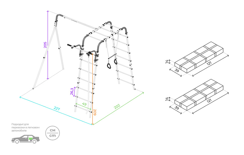 В набореканат, кольца с перекладиной, гимнастическая лестница, рукоход, турник подвижный, качели диск