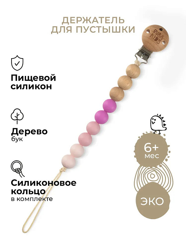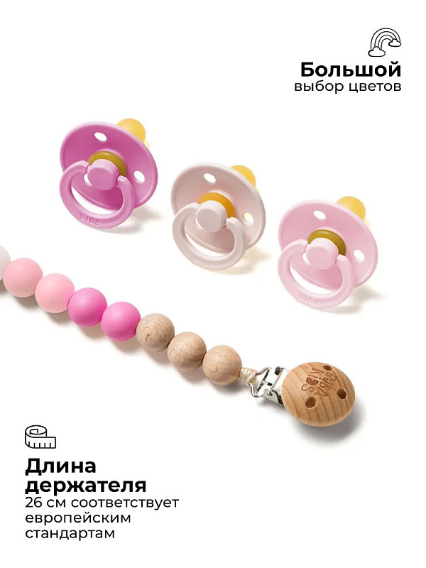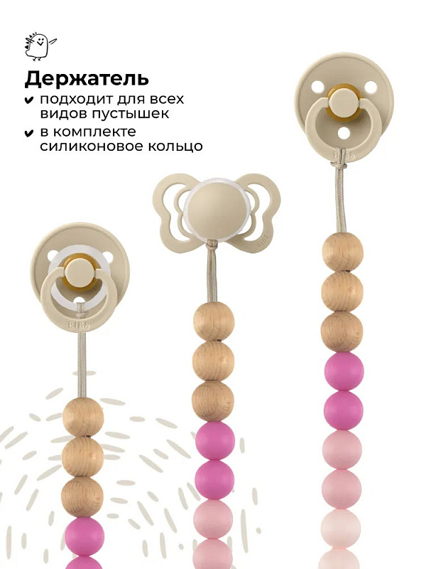 Держатель подходит для всех видов пустышек – как с ручкой (например, BIBS Colour/Boheme/DeLux), так и без ручки (BIBS Couture/Supreme/Infinity). В комплекте c держателем есть силиконовое колечко, которое используется для крепления пустышки без ручки.