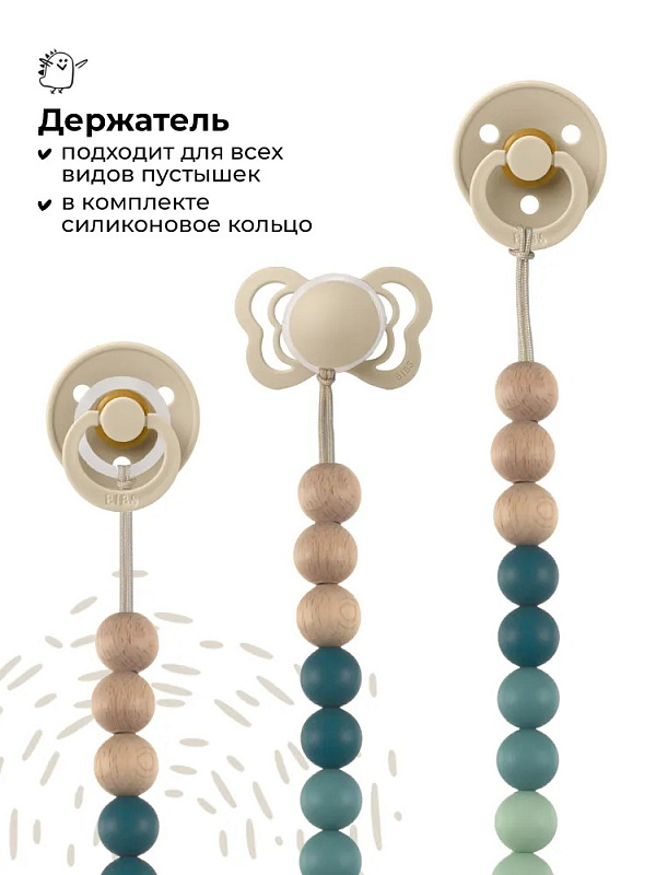 Держатель подходит для всех видов пустышек – как с ручкой (например, BIBS Colour/Boheme/DeLux), так и без ручки (BIBS Couture/Supreme/Infinity). В комплекте c держателем есть силиконовое колечко, которое используется для крепления пустышки без ручки.