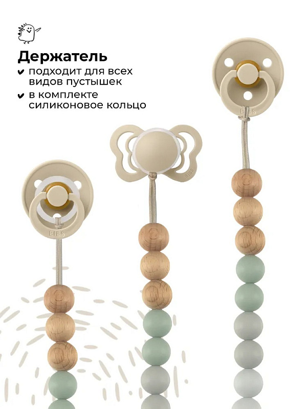 Держатель подходит для всех видов пустышек – как с ручкой (например, BIBS Colour/Boheme/DeLux), так и без ручки (BIBS Couture/Supreme/Infinity). В комплекте c держателем есть силиконовое колечко, которое используется для крепления пустышки без ручки.