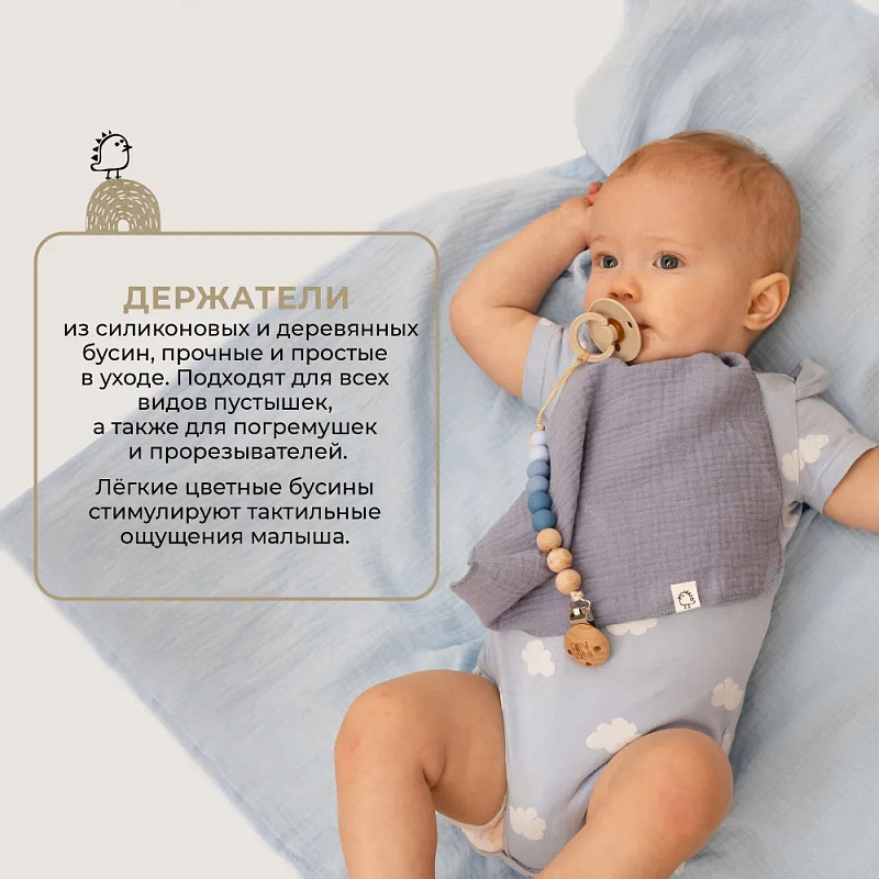 Малышам нравятся красивые и приятные на ощупь бусины, похожие на конфетки. Теперь любимая пустышка не потеряется и не упадет на пол.