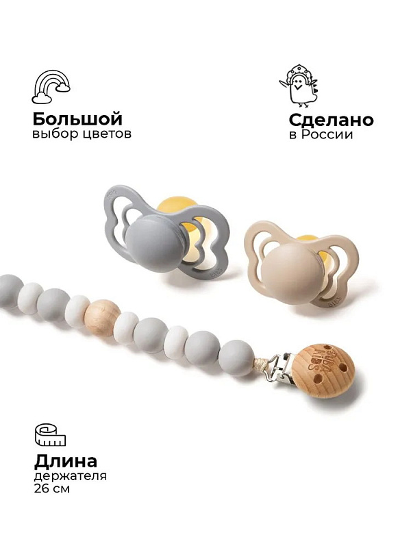 Держатель подходит для всех видов пустышек – как с ручкой (например, BIBS Colour/Boheme/DeLux), так и без ручки (BIBS Couture/Supreme/Infinity). В комплекте c держателем есть силиконовое колечко, которое используется для крепления пустышки без ручки.
