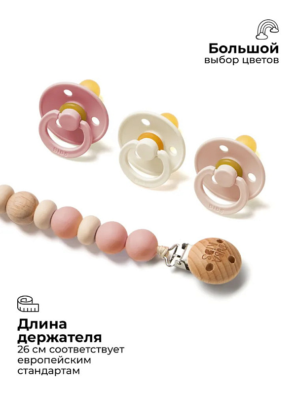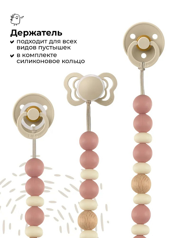 Держатель подходит для всех видов пустышек – как с ручкой (например, BIBS Colour/Boheme/DeLux), так и без ручки (BIBS Couture/Supreme/Infinity). В комплекте c держателем есть силиконовое колечко, которое используется для крепления пустышки без ручки.
